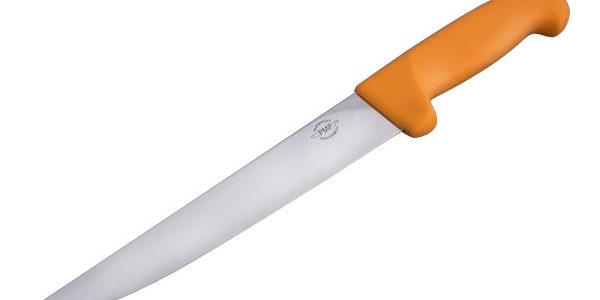 Professional stainless steel (inox) fleshing knife with polished finish, non-slip non-toxic polypropylene yellow rubber handle.